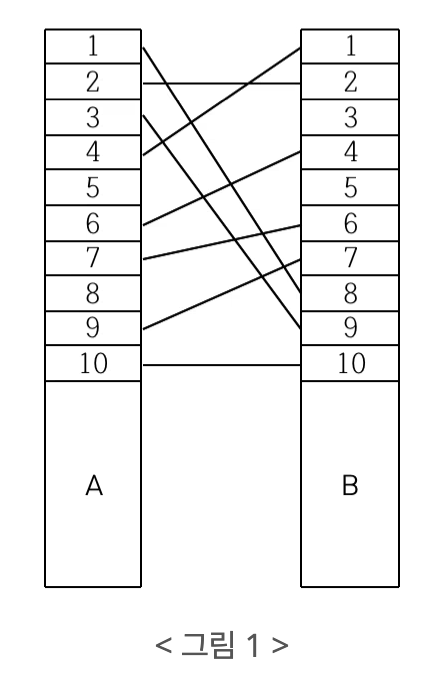 예를 들어, < 그림 1 >과 같이 전깃줄이 연결되어 있는 경우 A의 1번 위치와 B의 8번 위치를 잇는 전깃줄, A의 3번 위치와 B의 9번 위치를 잇는 전깃줄, A의 4번 위치와 B의 1번 위치를 잇는 전깃줄을 없애면 남아있는 모든 전깃줄이 서로 교차하지 않게 된다.