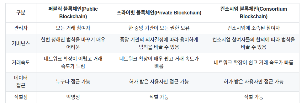 < 퍼블릭 & 프라이빗 & 컨소시움 블록체인 비교 >