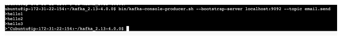 ex) bin/kafka-console-producer.sh --bootstrap-server localhost:9092 --topic email.send