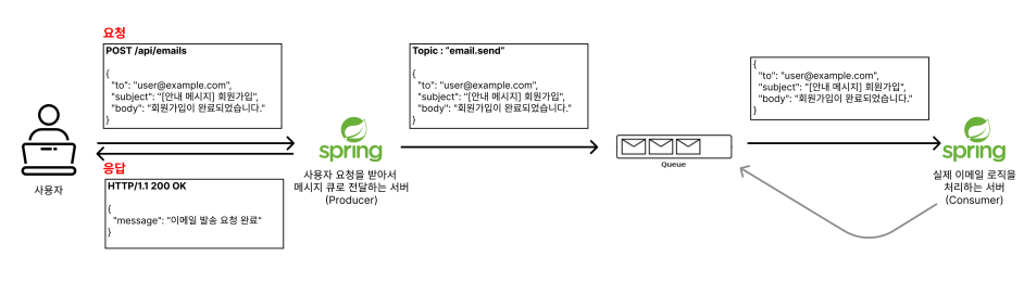 Producer 서버는 메시지 큐 에 메시지를 넣자마자 사용자에게 성공응답을 한다 (비동기방식)