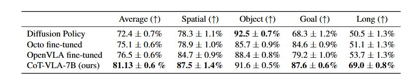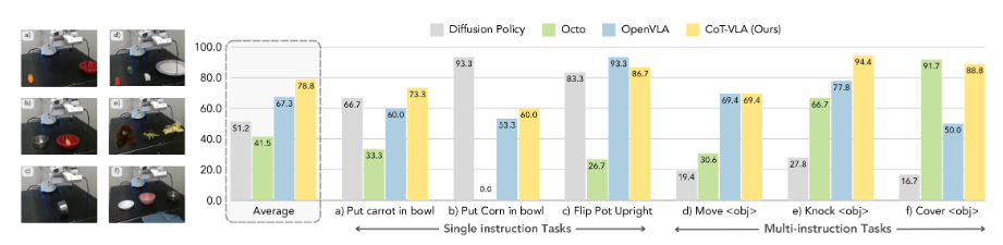 본 논문은 시각 및 행동 토큰(Tokens)을 이해하고 생성할 수 있는 SOTA 7B 파라미터 규모의 VLA인 CoT-VLA를 소개한다. 본 논문의 실험 결과에 따르면, CoT-VLA는 Real-world Manipulation Tasks에서 17%, Simulation Benchmarks에서 6%의 성능 향상을 기록하며 기존 SOTA VLA 모델을 능가하는 강력한 성능을 달성함을 입증한다.