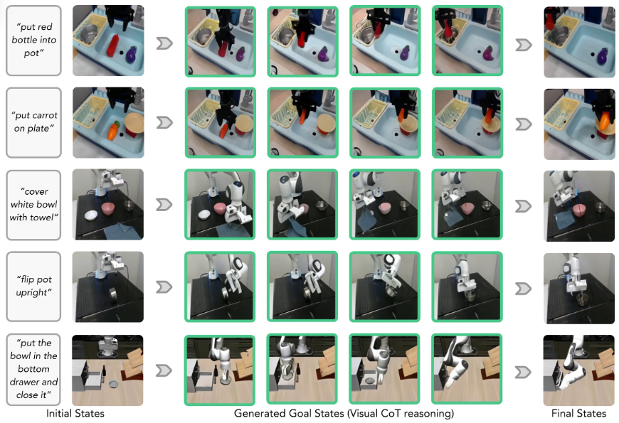 본 논문은 행동 생성 이전의 중간 추론 단계로서 서브골 이미지를 사용하여, VLA 프레임워크에 시각적 생각의 사슬 추론을 도입한다.