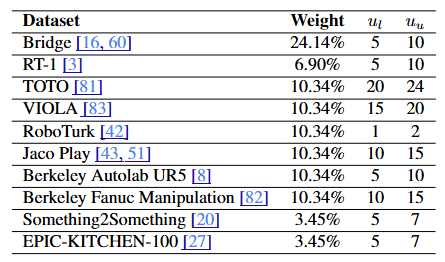 본 논문은 로봇 시연 사전 학습 데이터로 Open X-Embodiment 데이터셋 [48]의 일부를 선택하였으며, 행동 주석이 없는 비디오 데이터(Action-less video data)로는 Something-Something V2 [20]와 EPIC-KITCHEN-100 [27]을 사용했다.
