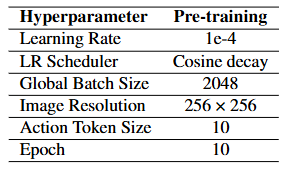 본 논문은 로봇 시연 데이터()와 행동 주석이 없는 비디오()를 조합하여 7B-base VILA-U 모델을 사전 학습(Pretraining)한다. 학습 과정에서 비전 타워(Vision tower)는 고정(Fixed)된 상태로 유지하며, LLM 백본(LLM backbone), 프로젝터(Projector), 그리고 뎁스 트랜스포머(Depth transformer)라는 세 가지 구성 요소를 최적화한다. 학습 목표는 두 가지 핵심 요소로 구성된다. Causal attention을 이용한 하위 목표 이미지 생성(Eq. 2)과 Full attention을 이용한 행동 생성(Eq. 3)이다.