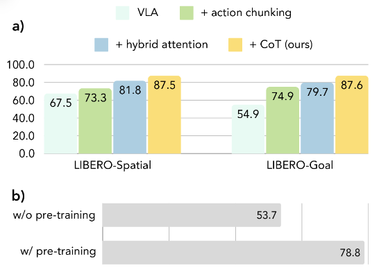 (a) LIBERO-Spatial 및 LIBERO-Goal 벤치마크 결과는 Action chunking, Hybrid attention, Visual chain-of-thought 추론이라는 세 가지 구성 요소의 유효성을 입증한다.