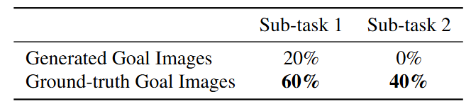 Table 3에서 보듯, 실측 목표 이미지를 사용하면 두 작업 모두에서 절대 성공률이 40% 향상된다. 이러한 성능 향상은 시각적 추론 및 목표 이미지 생성 기술의 발전이 로봇의 작업 수행 능력 향상으로 직접 이어질 수 있음을 시사한다. 본 논문의 방식은 여전히 분포 외 하위 목표 생성에 어려움을 겪고 있지만, 대규모 비디오 및 이미지 모델의 최근 발전은 스케일링을 통해 시각적 추론 능력을 개선할 수 있는 유망한 방향을 보여준다.