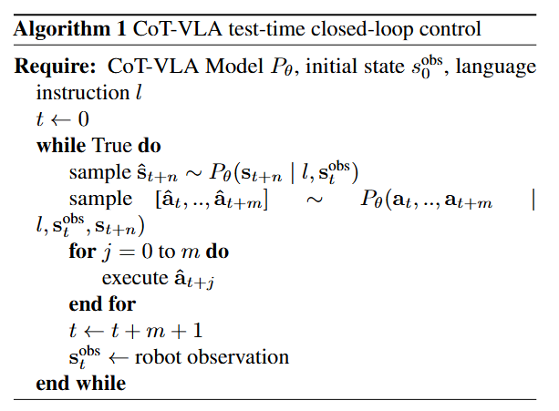 훈련 시 로봇 시연 데이터()만을 사용하는 기존의 VLA(Vision-Language-Action) 모델들과 달리, CoT-VLA는 중간 단계인 Visual Chain-of-Thought 추론 단계를 통해 행동 주석이 없는 비디오 데이터()를 사전 학습에 활용한다. 이를 통해 로봇 시연 데이터보다 훨씬 풍부한 캡션이 달린 비디오만으로도 역학(Dynamics)과 지시문 이행(Instruction following)을 모두 학습할 수 있다.