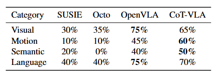 SUSIE [2]는 확산 사전 학습(Diffusion prior)을 통해 시각적으로 더 높은 품질의 목표 이미지를 생성하지만(본 논문의 한계에 대한 자세한 논의는 Section 5 참조), 새로운 객체가 포함되거나 복잡한 언어 접지가 필요한 작업에서는 더 낮은 성공률을 기록했다. OpenVLA [29]와 비교했을 때, CoT-VLA는 시각적 추론의 오류보다는 Action chunking으로 인한 파지(Grasping) 실패(섹션 5 참조)로 인해 시각 및 언어 일반화 작업에서 약간 낮은 성공률을 보인다. 그러나 CoT-VLA는 전반적으로 네 가지 일반화 범주 모두에서 경쟁력 있는 성능을 입증하며, 베이스라인 접근 방식들과 비슷하거나 더 나은 결과를 달성했다.