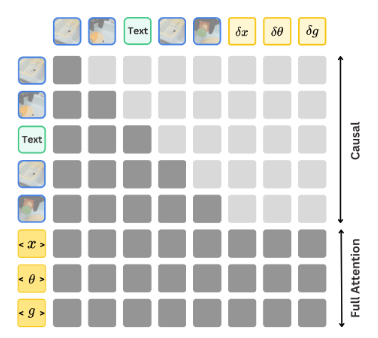 CoT-VLA의 Hybrid attention 메커니즘. 본 논문은 이미지 또는 텍스트 생성에는 Causal attention을 사용하고, Action generation에는 Full attention을 사용한다. , , 는 행동의 Parallel decoding을 위한 특수 토큰이다.