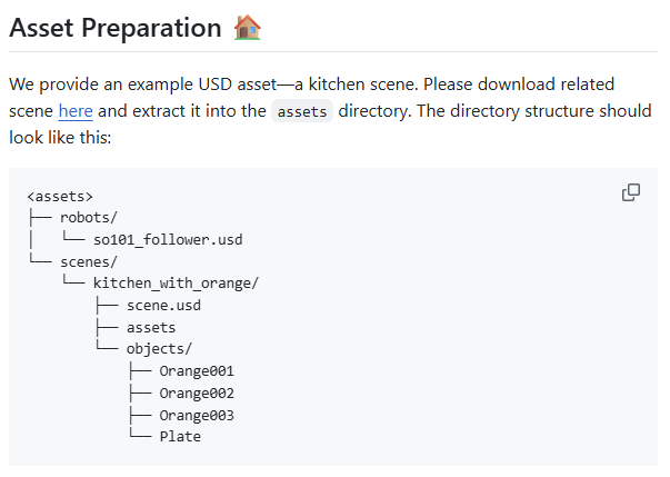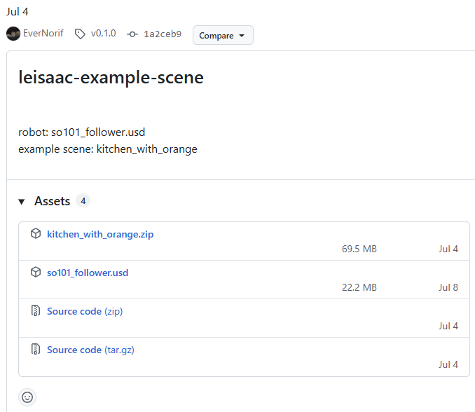 현재 leisaac (v0.2.0) 기준으로 웬만한 정보는 leisaac 도큐먼트로 넘어가고, 깃허브 리드미에서 링크로 에셋을 받을 수 있었는데 그게 없어졌다. 이전 버전 릴리즈 링크 <여기>에서 leisaac-example-scene (v0.1.0) 의 asset 압축 파일(kitchen_with_orange.zip)과 usd (so101_follower.usd)를 내려 받으면 된다. (아래 참조)