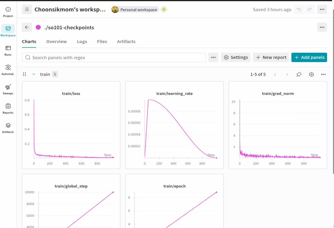wandb를 활성화한 경우, 아래처럼 학습 과정에서 train loss나 gpu usage 등을 대시보드형태로 모니터링할 수 있다.