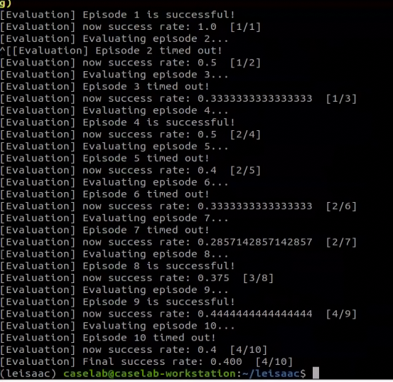 위 옵션으로 하면 eval_round 횟수 동안 에피소드를 수행하고, 평가하게 되는데 (타임아웃 되면 실패로 처리됨) 허깅페이스 데이터셋으로 학습하면 에피소드 수가 적어서 그런지 성공률은.... pretty 처참쓰
