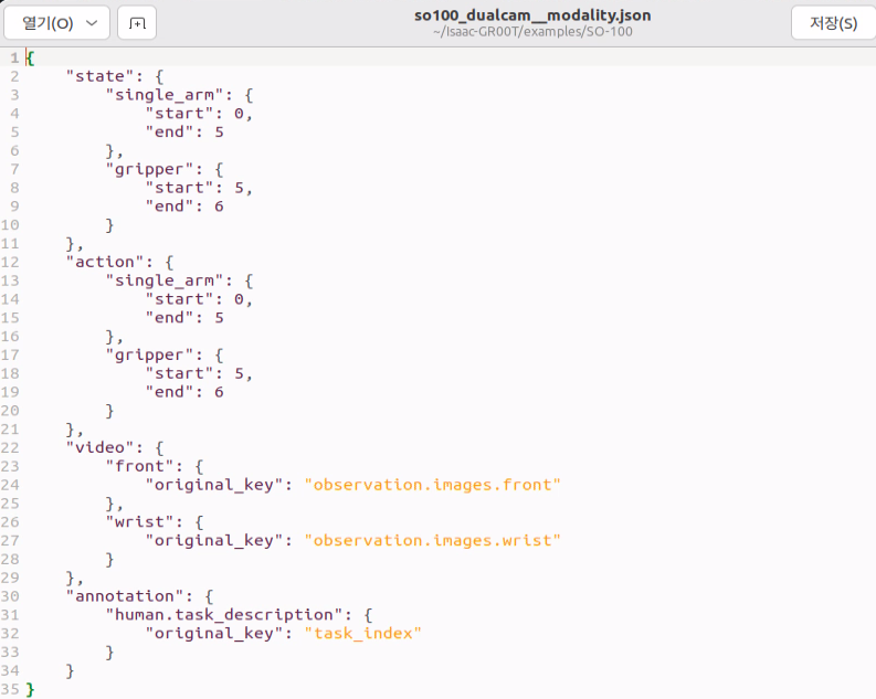 이제 Gr00t를 파인튜닝하기 위해 필요한 메타 데이터인 modality를 기존 Gr00t 파일에서 가져와서, /meta 디렉토리 내부에 붙여 넣어야 한다.