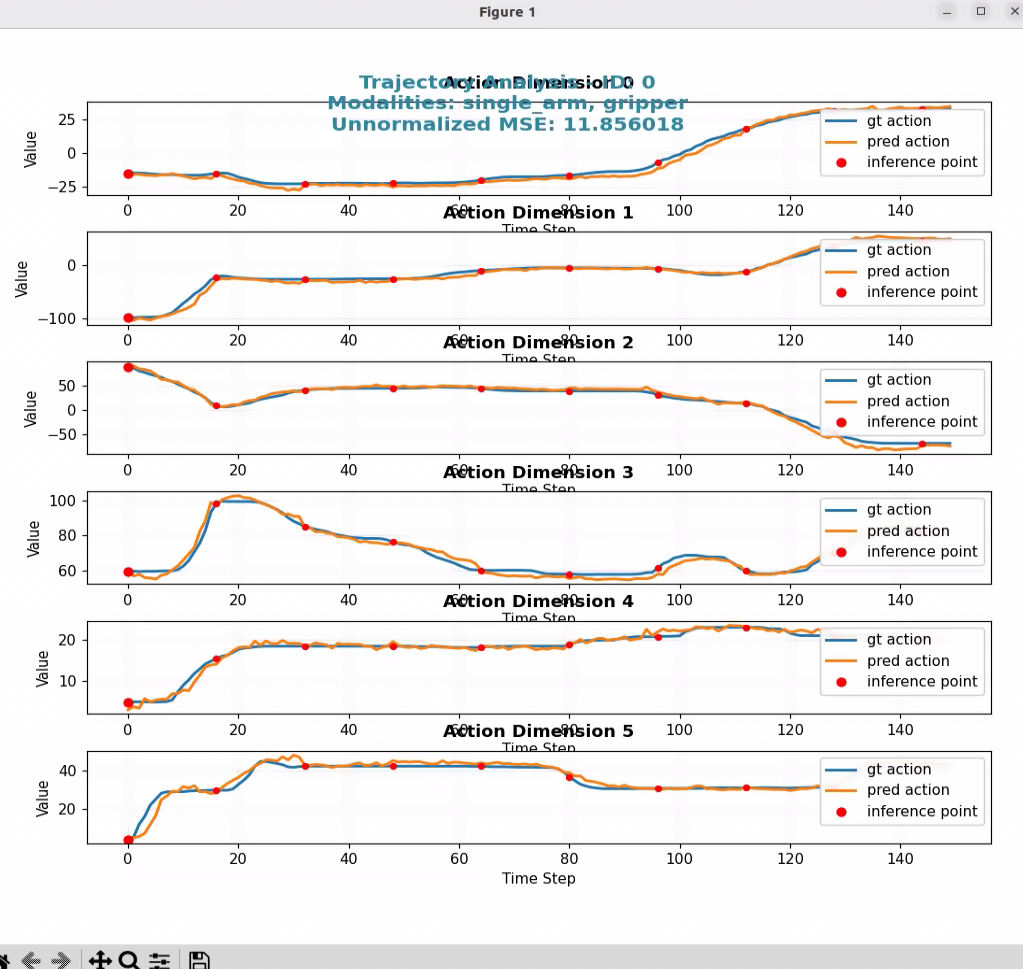 학습을 했으면 평가를 해야겠지? 아래 코드로 사용한 so-arm 모델이 6-DoF 이기 때문에 6개의 action space에 대해서 GT/Pred를 비교하고, 시각화 해 볼 수 있다.