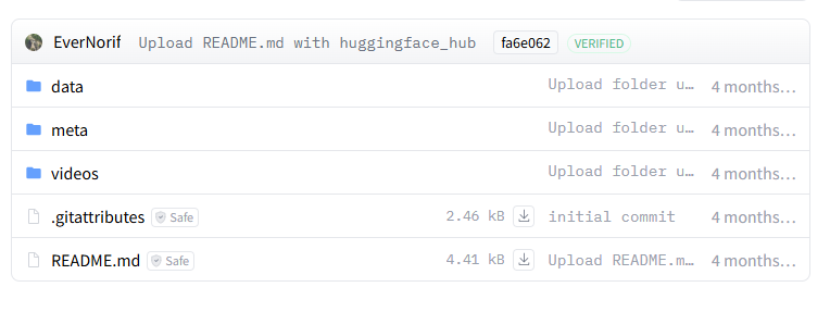 data 폴더 : 데이터셋 분할(chunk) 단위에 각 episode 수행 과정 정보가 .parquet 형식으로 저장되어 있음. chunk를 쓰는 이유는 대용량 데이터 관리를 위함인데 위 데이터셋은 총 에피소드 개수가 많지 않기 때문에 chunk가 1개 뿐이다.