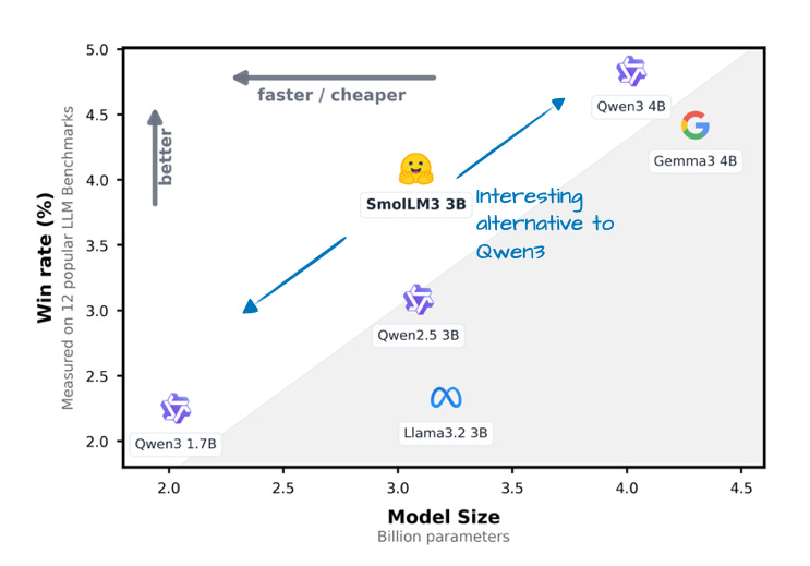 [Figure 20: An annotated figure from the SmolLM3 announcement post,comparing the SmolLM3 win rate to Qwen3 1.7B and 4B as well as Llama 3 3B and Gemma 3 4B.]