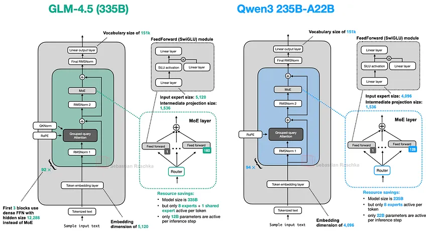 두 설계는 대체로 유사하지만, GLM-4.5는 DeepSeek V3에서 처음 도입된 구조적 선택을 채택했다. 즉, Mixture-of-Experts (MoE) 블록 앞에 3개의 밀집(dense) 레이어를 배치하는 것이다.