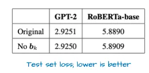 이러한 편향 유닛은 GPT-2 시절 이후로는 거의 사용되지 않았으며, 일반적으로 불필요한 것으로 간주된다. 실제로, 최근 한 논문은 이것이 적어도 키 변환(k_proj)에 대해서는 수학적으로 사실임을 보여준다.