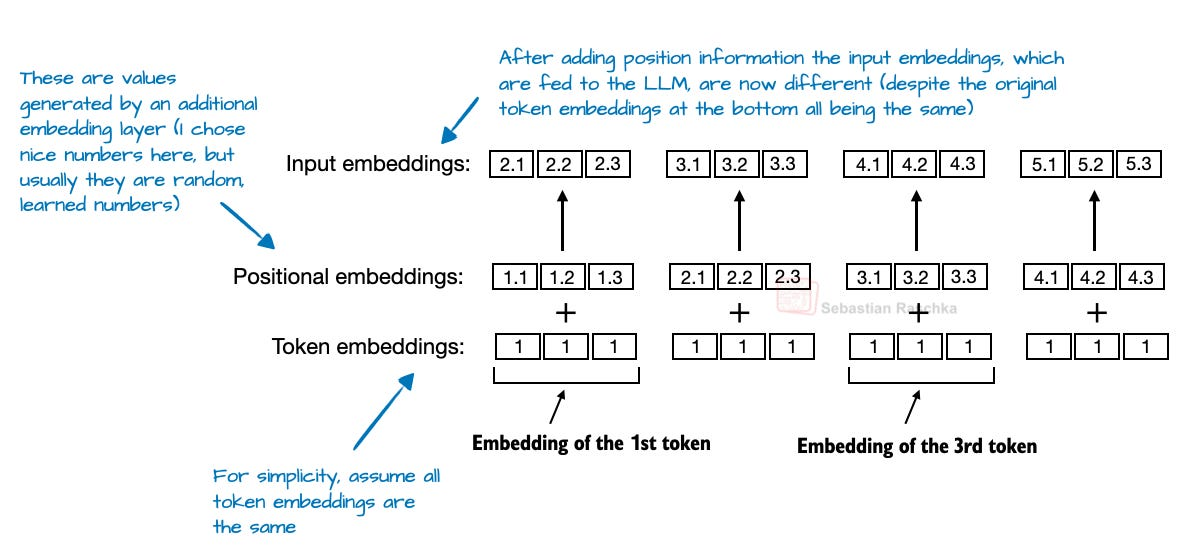 Figure 22: A modified figure from Build A Large Language Model (From Scratch) book illustrating absolute positional embeddings.