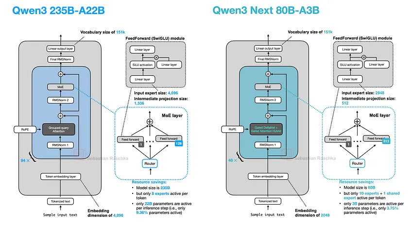 중간 차원이 두 배라는 점에서 고전적인 공유 전문가 설계와 동일하지는 않지만, 아이디어는 같다. (Qwen3가 공유 전문가를 생략했다는 점은 여전히 흥미로운 지점이며, 이러한 선택이 Qwen4 및 후속 모델에서 변경될지 여부는 앞으로 지켜볼 부분이다.)