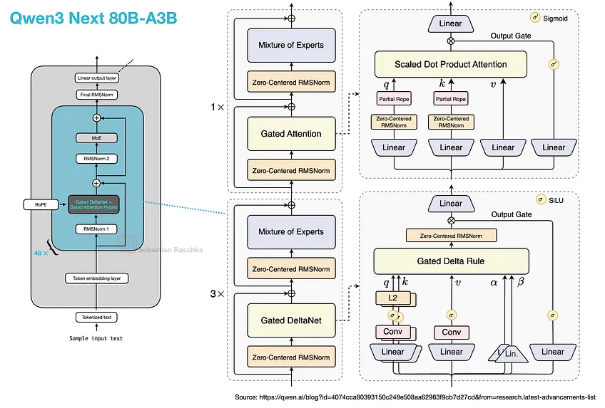 [Figure 36: The Gated DeltaNet + Gated Attention hybrid mechanism. Note that these are arranges in a 3:1 ratio, meaning that 3 transformer blocks with Gated DeltaNet are followed by 1 transformer block with Gated Attention. The right subfigure is from the official Qwen3 blog]