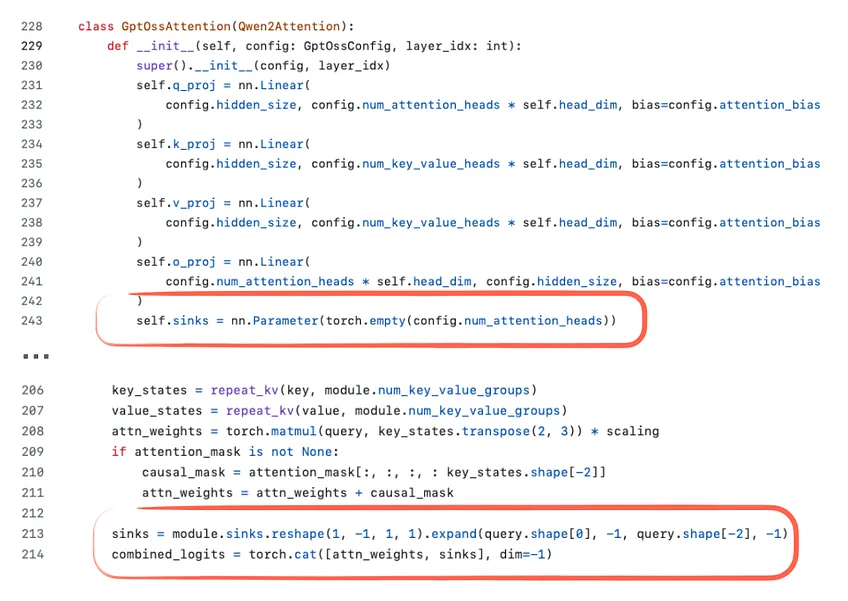 또 다른 세부 사항으로 [그림 30]의 코드 스크린샷에 정의된 sink가 있다. 일반적인 모델에서 attention sink는 어텐션을 안정화하기 위해 시퀀스 시작 부분에 배치되는 특별한 '항상 주목받는(always-attended)' 토큰으로, 특히 긴 컨텍스트(long-context) 시나리오에서 유용하다.