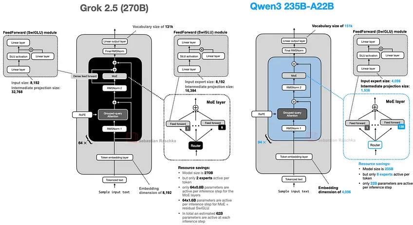예를 들어, Grok 2.5는 소수의 대형 전문가(8개)를 사용하는데, 이는 과거의 경향을 반영한다. 앞서 논의했듯이, DeepSeekMoE 논문이나 Qwen3와 같은 최신 설계는 다수의 소형 전문가를 선호한다.