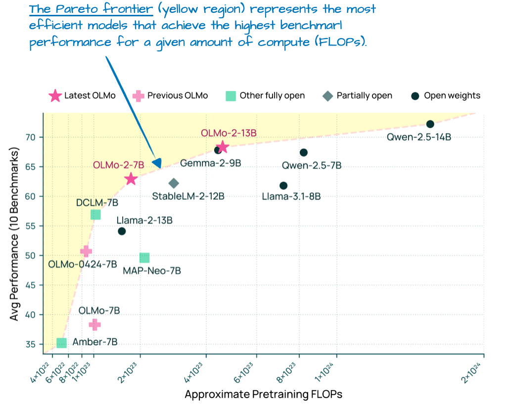 OLMo 모델은 투명성으로 널리 알려져 있지만, 성능 또한 준수한 편이다. 실제로 1월 출시 시점(Llama 4, Gemma 3, Qwen 3 이전)에는 아래 [그림 7]에서 볼 수 있듯이, OLMo 2 모델이 연산 대비 성능의 파레토 프론티어(Pareto frontier)에 위치해 있었다.