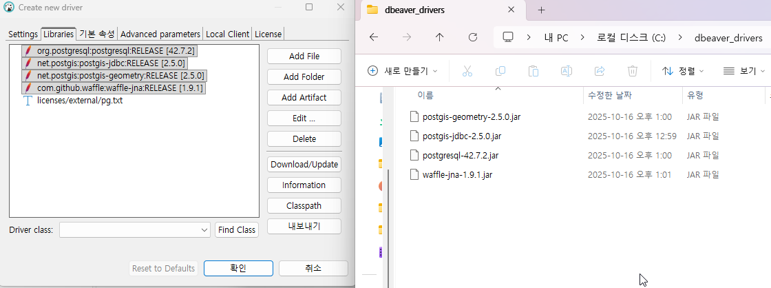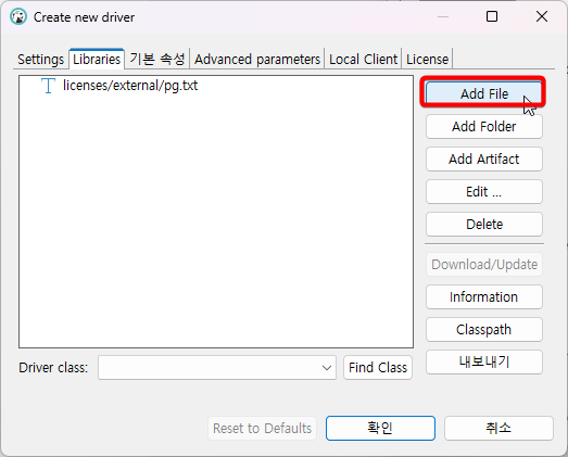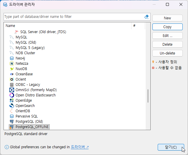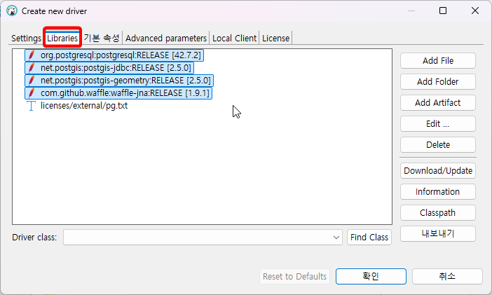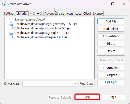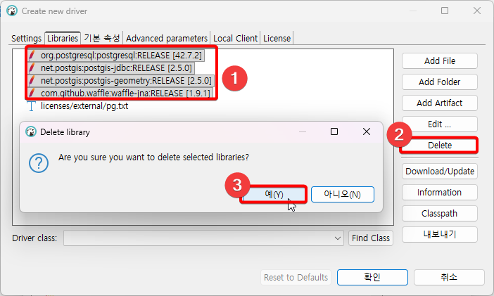 이후에 Dbeaver 로 돌아와서 Libraries 탭에서 위처럼 기존 목록을 삭제해주세요.