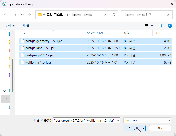 앞서 다운로드 받았던 jar 들을 모두 선택해주세요.