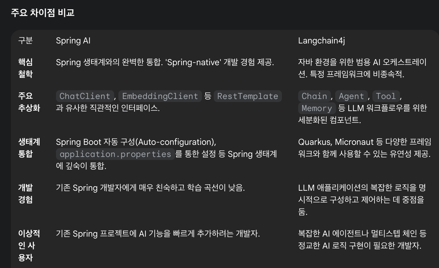 Spring AI는 Spring 프레임워크에 AI 기능을 'Spring다운 방식'으로 자연스럽게 녹여내는 것을 목표. 반면, Langchain4j는 파이썬 LangChain의 성공에 영감을 받아, 어떤 자바 프로젝트에서든 LLM(거대 언어 모델) 기반 애플리케이션을 쉽게 구축할 수 있도록 돕는 독립적인 AI 오케스트레이션 라이브러리.