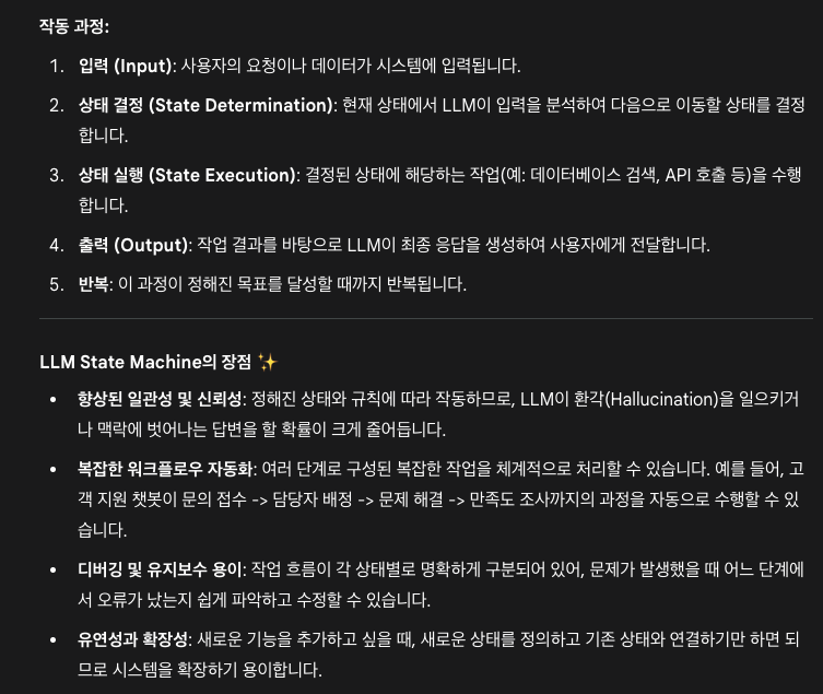 LLM State Machine은 간단한 프로토타입이나 유연성이 극도로 중요한 일부 시나리오에서는 유용. 하지만 안정성, 신뢰성, 성능이 중요한 상용 애플리케이션을 구축할 때는 Code State Machine이 훨씬 더 적합한 아키텍처. 이는 LLM의 강력한 언어 능력과 코드의 견고함 및 예측 가능성이라는 두 세계의 장점을 모두 취하는 현명한 접근 방식.
