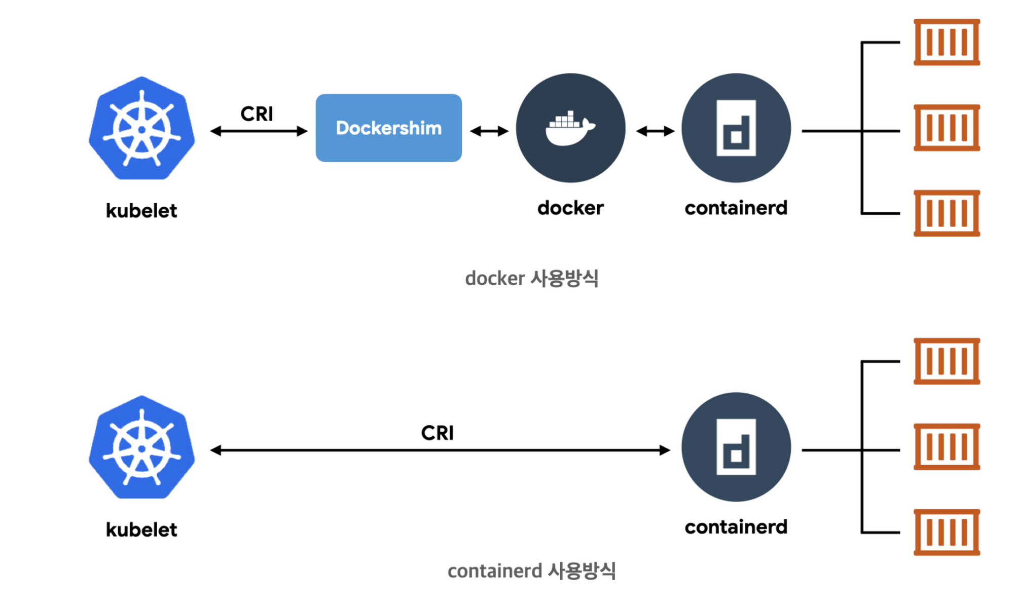 - containerd, CRI-O가 CRI를 직접 지원 → kubelet과 바로 통신 가능