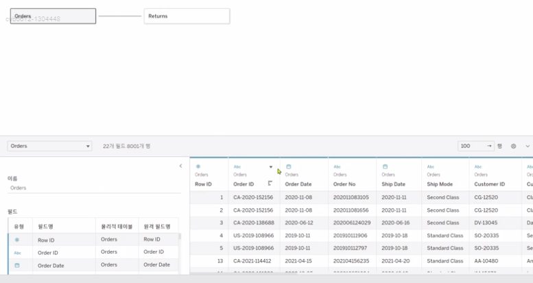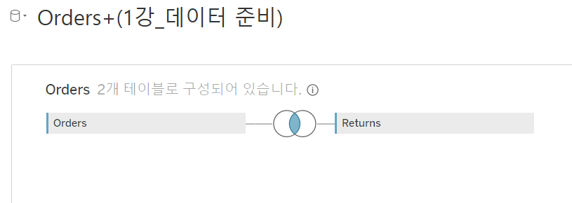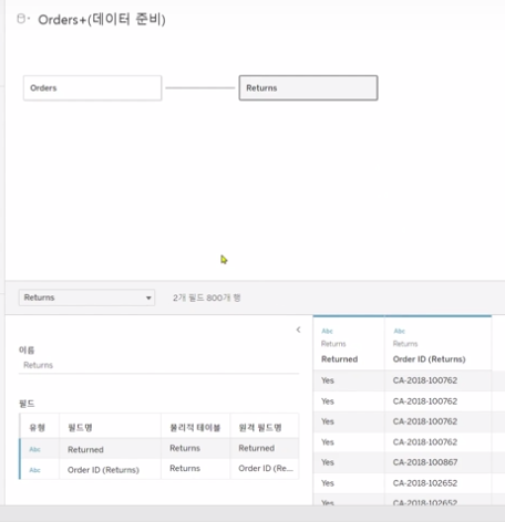 조인하려는 시트(여기서는 Return 시트)를 드래그해서 오른쪽으로 가져다 놓으면 다이어그램이 표시되고, 테블로에서 자동적으로 inner join으로 테이블을 연결함.