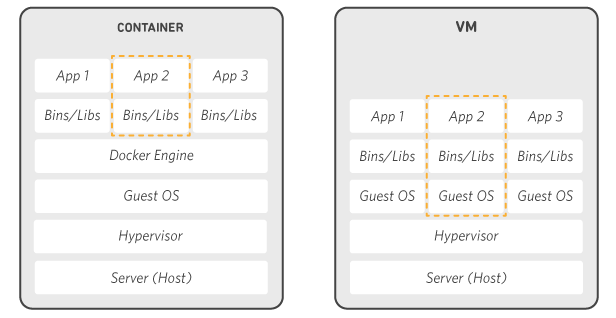 우리는 흔히 가상화 기술을 떠올리면 VMware나 VirtualBox와 같은 가상 머신을 떠올린다. 가상 머신은 Docker container와 비교했을 때 내부적으로 큰 차이가 있다. VM(가상 머신)은 응용 프로그램 소프트웨어, 종속성 및 게스트 OS가 포함되어 있다. 즉 배포할 각 애플리케이션 스택마다 별도의 VM과 게스트 OS가 필요하고, 이것은 이러한 것들은 곧 성능의 문제와 직결된다.