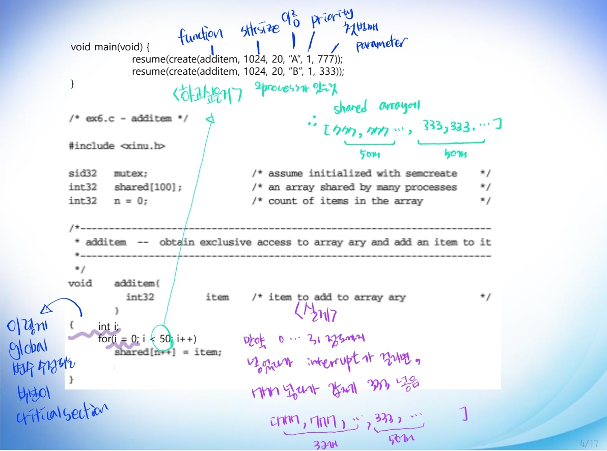 mask = disable( ); /* 여러 개의 user가 하나의 kernal을 공유하므로, 한 user가 API 사용할거면, 이런식으로 인터럽트 diable을 걸어서, 자기가 다 사용한 다음에 다른 user에게 kernal 사용권을 넘겨줘야 = kernal protection */