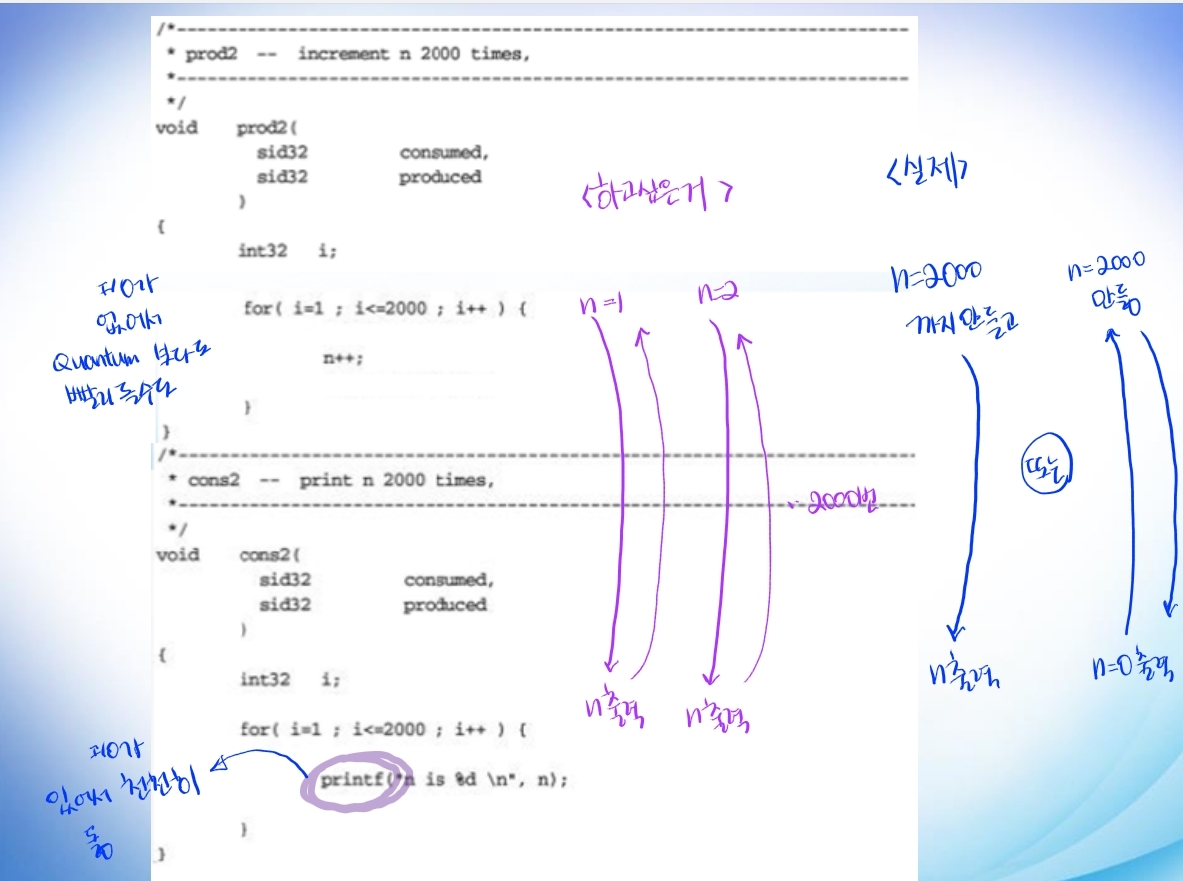 🤞 1. 초기 n=0. prod2를 통해 n을 1로 증가시키고, cons2로 가서 n출력, prod2를 통해 n을 2로 증가시키고, 다시 cons2로 가서 n출력 ... 2000번 반복이 목적인 코드