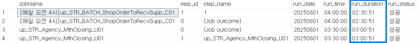 그런데 문제는 이 마감 작업이 데이터를 점유한 상태로 장시간 실행되면서, 4시에 실행된 수불 인터페이스 작업(up_STR_BATCH_ShopOrderToRecvSupp_C01)도 해당 테이블에 접근하려다 서로 자원을 점유하면서 병목 현상이 발생하게 됩니다.