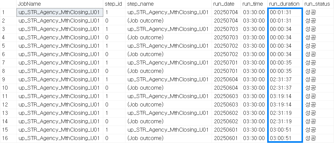 6월 1일 오전 3시 30분에 시작된 전월 미입금 마감 배치 작업(up_STR_Agency_MthClosing_U01)이 예상보다 훨씬 오래 걸리며 약 3시간 이상 소요되었습니다.