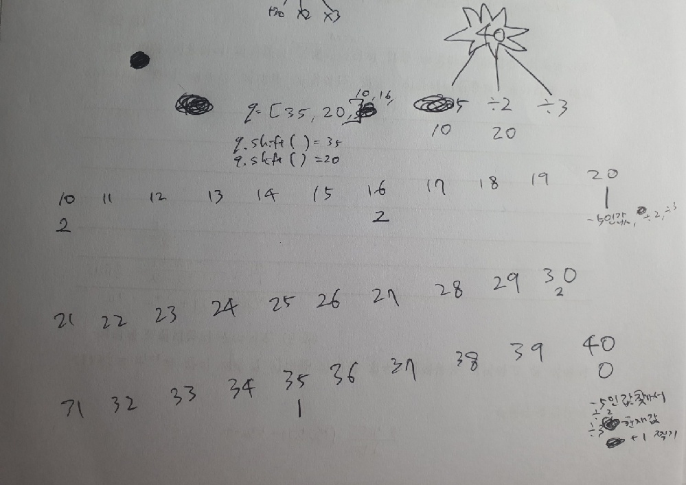 지저분한 초딩 낙서 같지만, 자세히 보면 내가 문제를 풀었던 아이디어가 잘 담겨 있어서 약간의 웃음벨도 있어서 가져왔다. 파이썬으로 풀거면서 아직도 js가 익숙하니 무의식적으로 shift()라고 메모한 게 웃기닼ㅋㅋ 40에 불가사리는 왜 그린거??