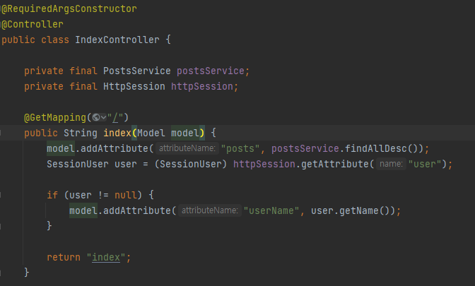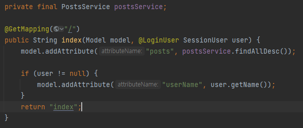 모든 설정이 끝났으니 IndexController의 코드에서 반복되는 부분들을 모두 @LoginUser로 개선하자.