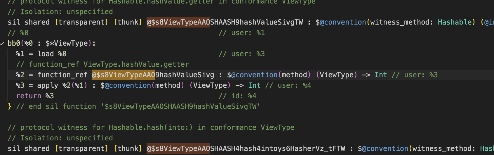 SIL 코드에서 @$s8ViewTypeAAO21__derived_enum_equalsySbAB_ABtFZ 같은 괴상한 이름들을 봤을거에요.