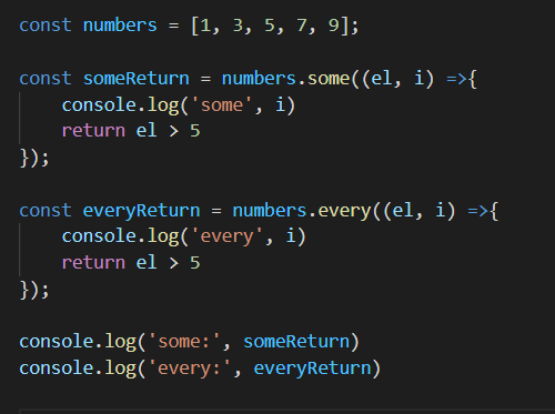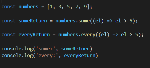 • 배열 요소들 중에 5보다 큰 숫자(7,9)가 존재하므로 some 메소드를 이용하면 true, every 메소드를 이용하면 false가 된다.