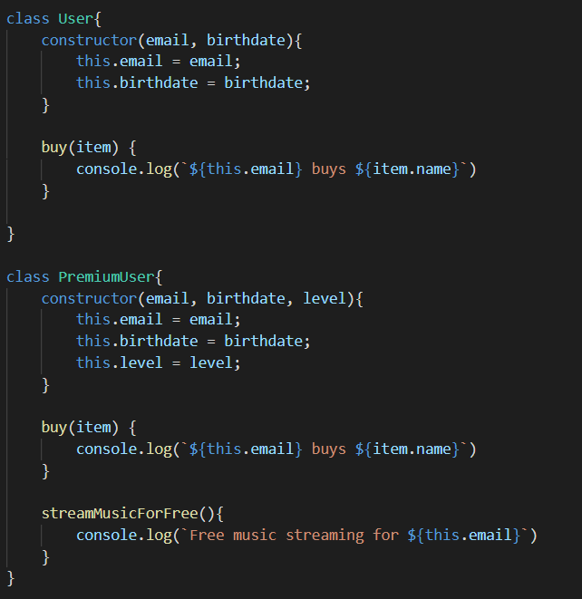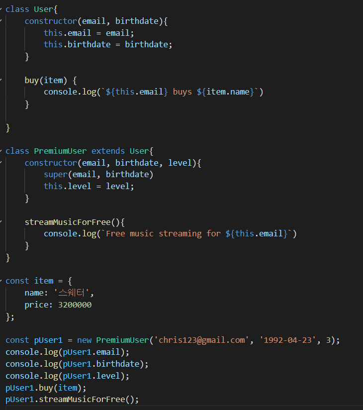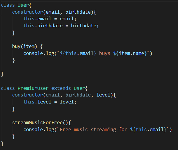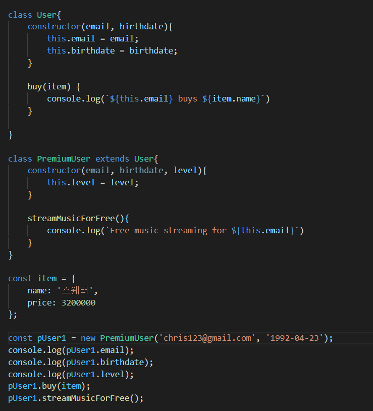 위에 있는 코드를 잘 보면 프리미엄유저 클래스는 위에 유저클라스와 비슷한 면이 있다. this.email, this.birthdate 그리고 buy 메소드가 겹친다. 그러면 굳이 반복해서 안써도 된다. 바로 위에 있는 user 클래스를 프리미엄으로 상속받게하면면 된다.