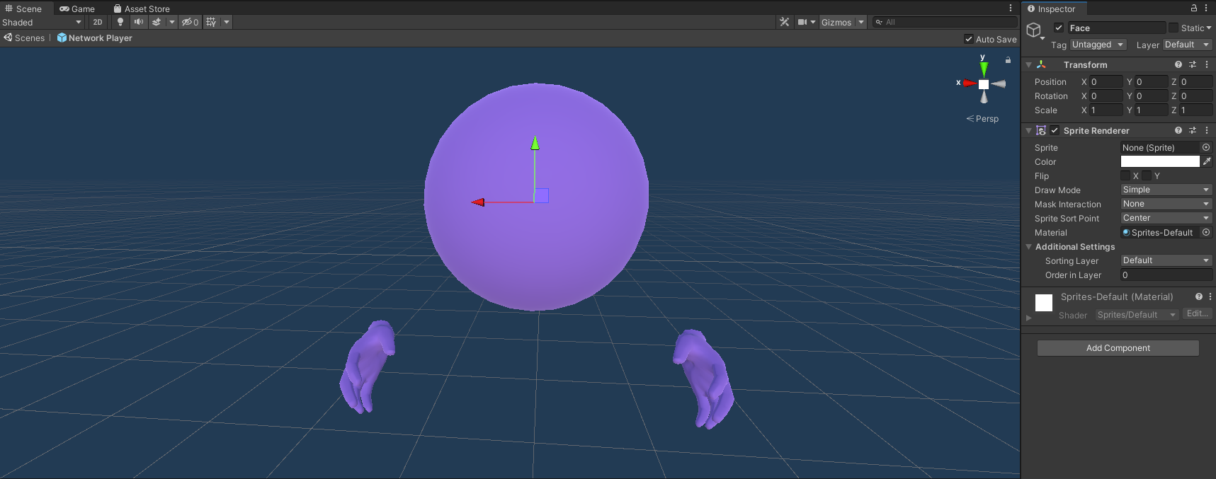 아바타라고 해서 대단한건 아니고, 구 형태의 얼굴과 손을 프리팹으로 만들어 놓은 아주 단순한 형태이다. 튜토리얼을 간단히 요약하면, 아바타 프리팹에 표정을 넣을 오브젝트를 추가하고 해당 오브젝트에 애니메이션을 적용시키는 것이다.