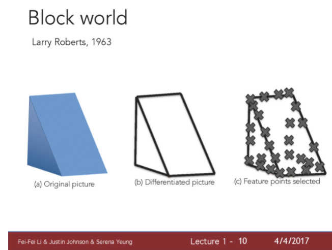 또한 1963년 Larry Roberts의 Block World 는 눈에 보이는 사물들을 기하학적 모양으로 단순화했고, 세상을 시각으로써 인식하고 모양을 단순하게 재구성하는 최초의 컴퓨터 비전 학위 논문을 냈다.