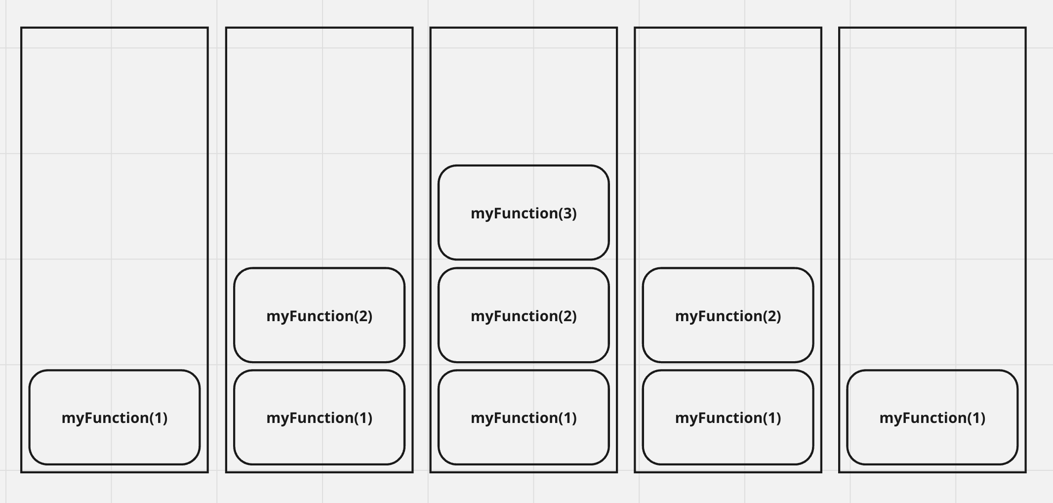 위의 그림은 myFunction(1)을 실행했을 때의 콜스택 상황을 시각화 한 그림이다. 이 그림을 이해하고 넘어간다면 스택의 큰 그림을 이해했다고 생각한다.