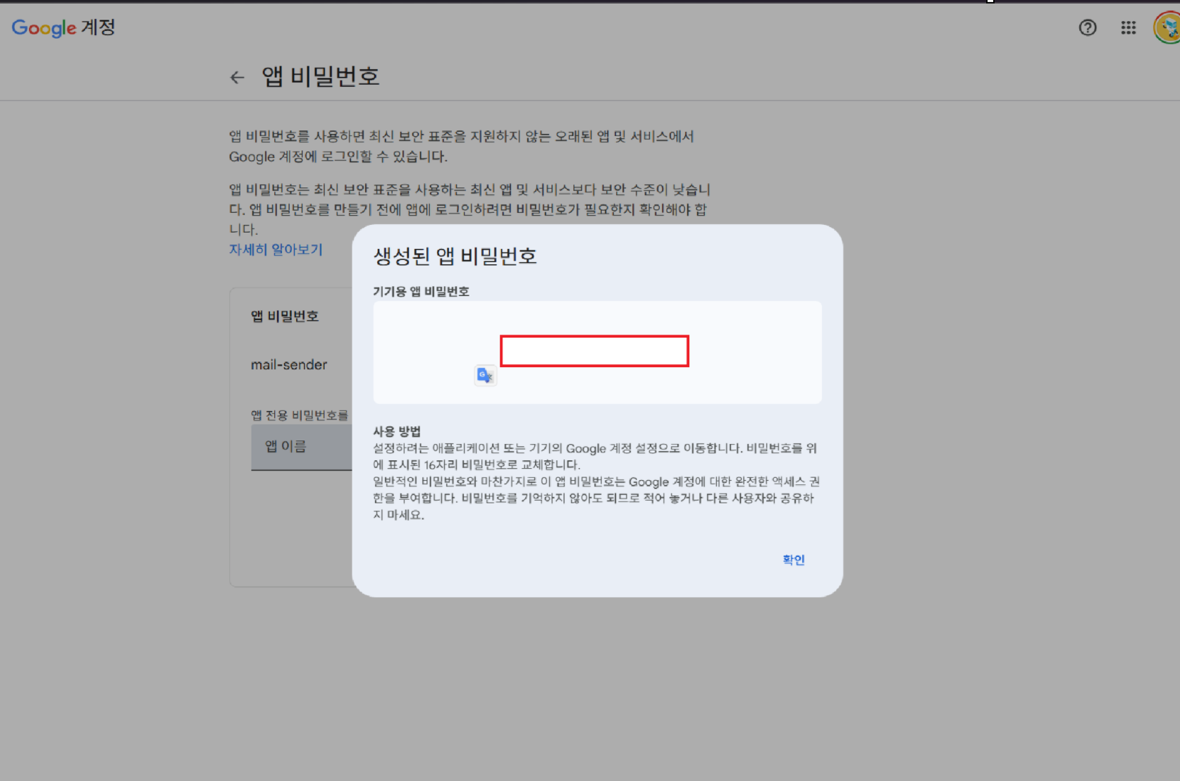 생선된 앱 비밀번호는 springboot 설정시 적어주어야 한다.