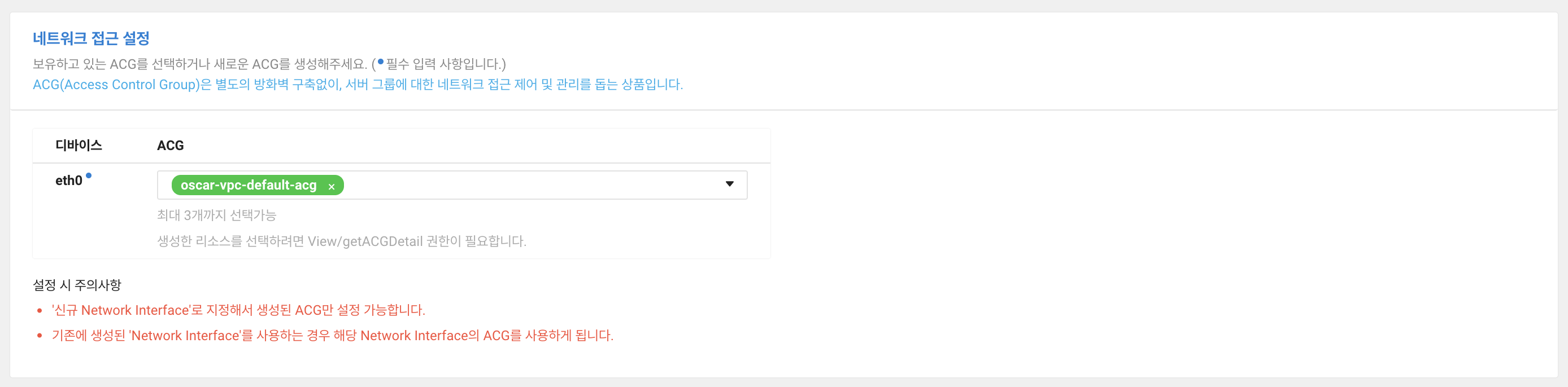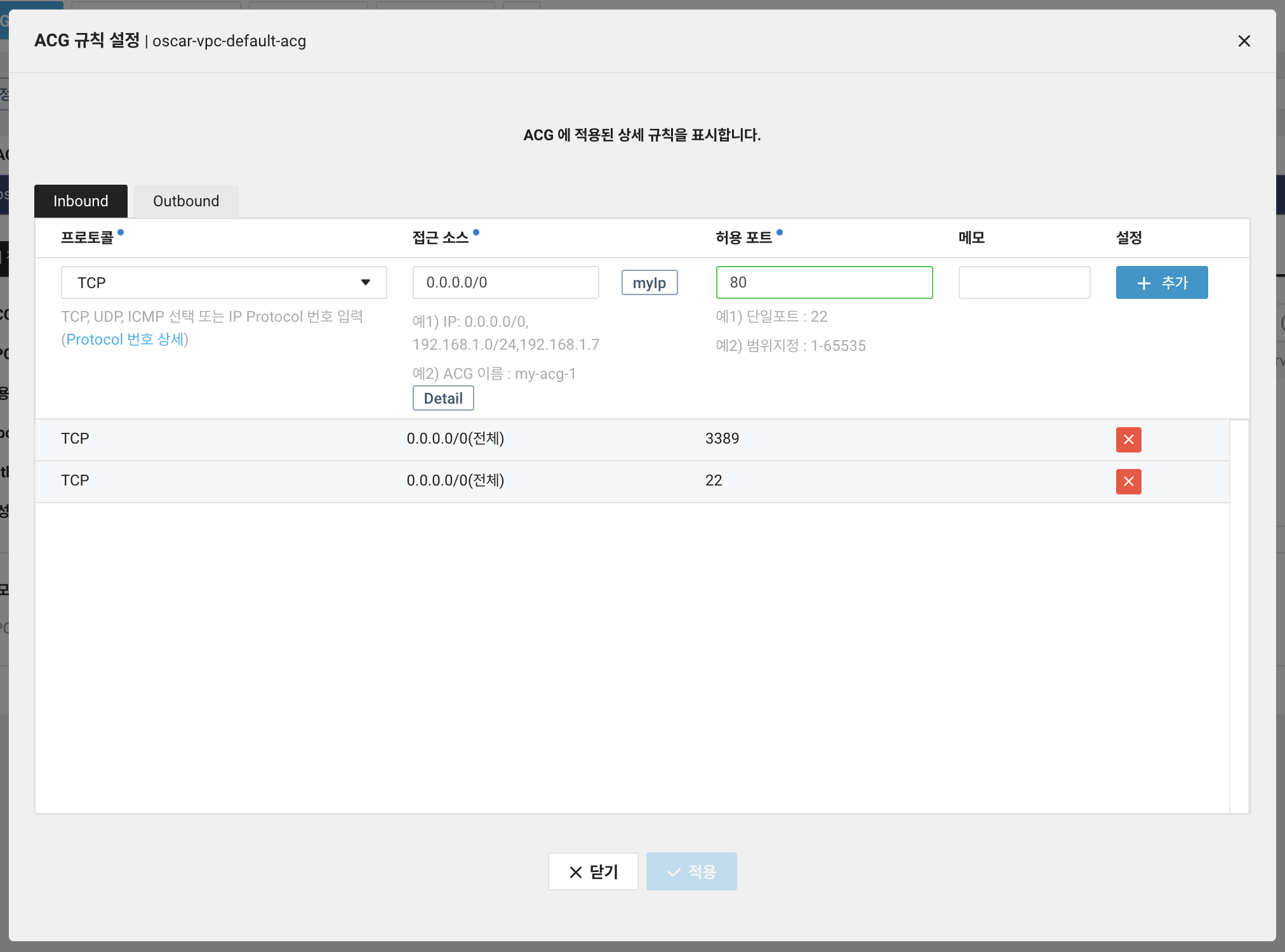 새로운 ACG를 생성하거나 VPC생성시 자동 생성된 default-acg 설정을 변경한다. 이 글에서는 서버를 생성할 때 default-acg를 선택했기때문에 수정을 진행했다. ACG를 새로 생성했다면, 서버 설정에서 ACG를 변경해주면 된다.