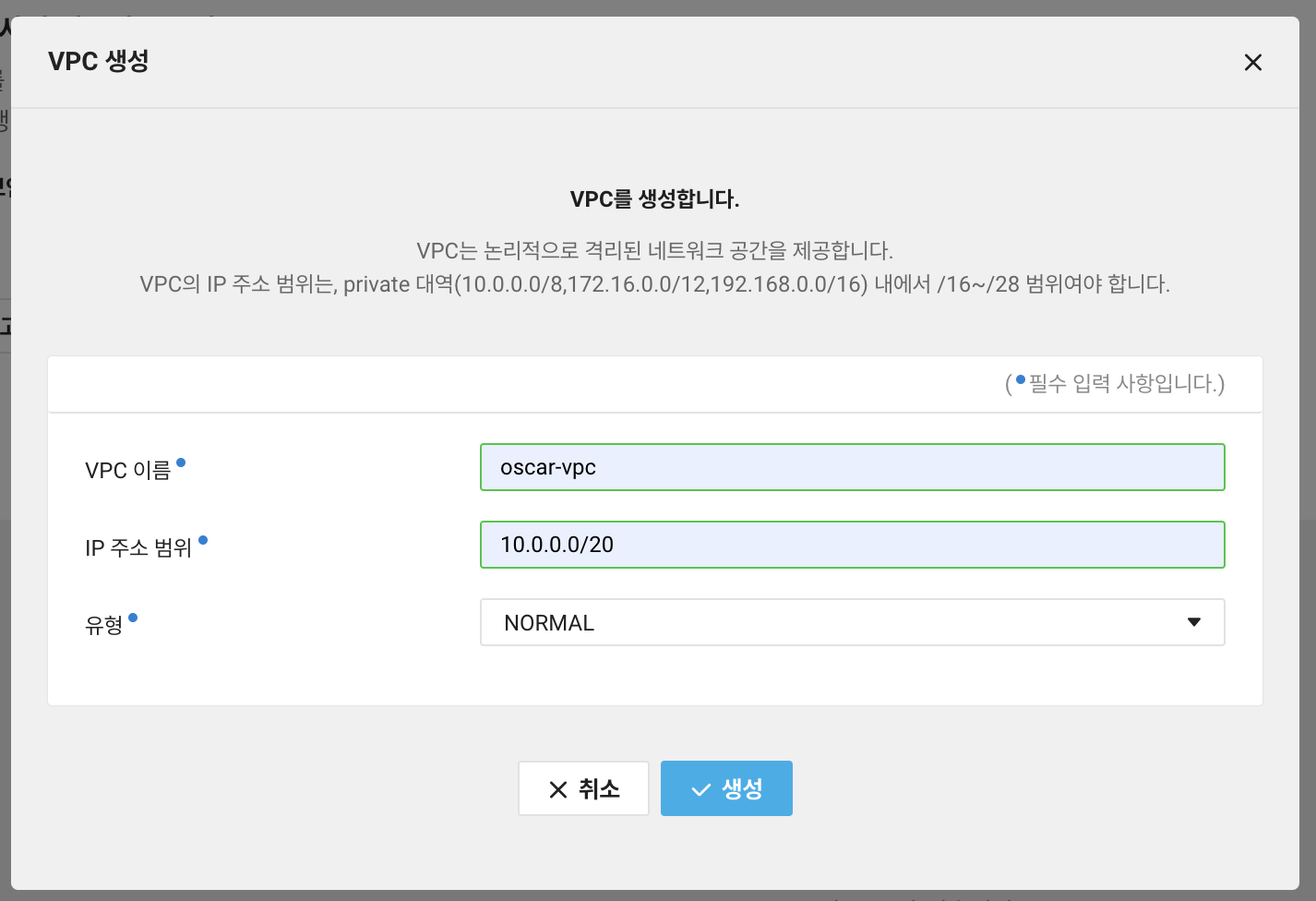 VPC 생성을 누르고 원하는 조건으로 설정을 진행한다.
